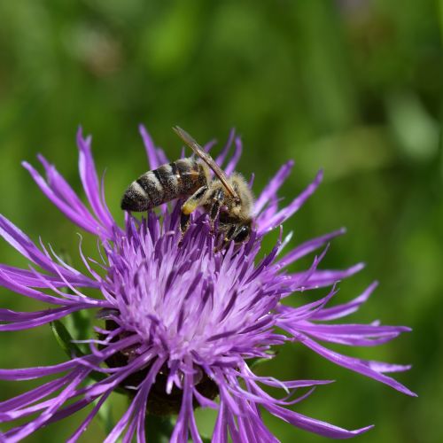 Cette abeille solitaire raffole des centaurées ou des scabieuses. La centaurée jacée fait partie de ses "restaurants" favoris. Elle y récolte le pollen et l' abondant nectar. Sa floraison dure jusqu'en fin d'été, ce qui offre un point de butinage précieux en septembre alors que bien des fleurs sont fanées. La centaurée jacée est visitée par différentes sortes d'abeilles ainsi que par les papillons (la piéride par exemple). Pour les abeilles domestiques, le rendement à l'hectare est estimé entre 100 et 200Kg de miel produit ! (source: Botanique apicole d'Eric Melin - ULg - 2012). Dans vos jardins, semez des fleurs sauvages. Natura Loci est spécialisé en prairies fleuries sauvages et pérennes. Visitez-nous sur www.naturaloci.be !