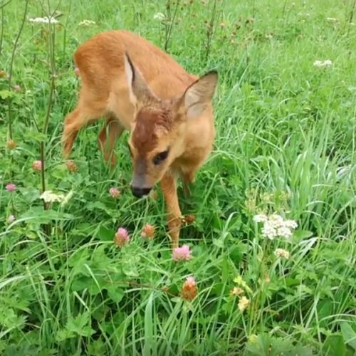 Ce jeune faon savoure son repas dans une prairie variée. Ne vous y trompez pas, il ne broute pas n'importe quoi: sa bouche délicate et son odorat raffiné lui permettent d'être très sélectif dans le "menu". Le chevreuil est un gourmet exigeant (plus que son cousin le cerf).
